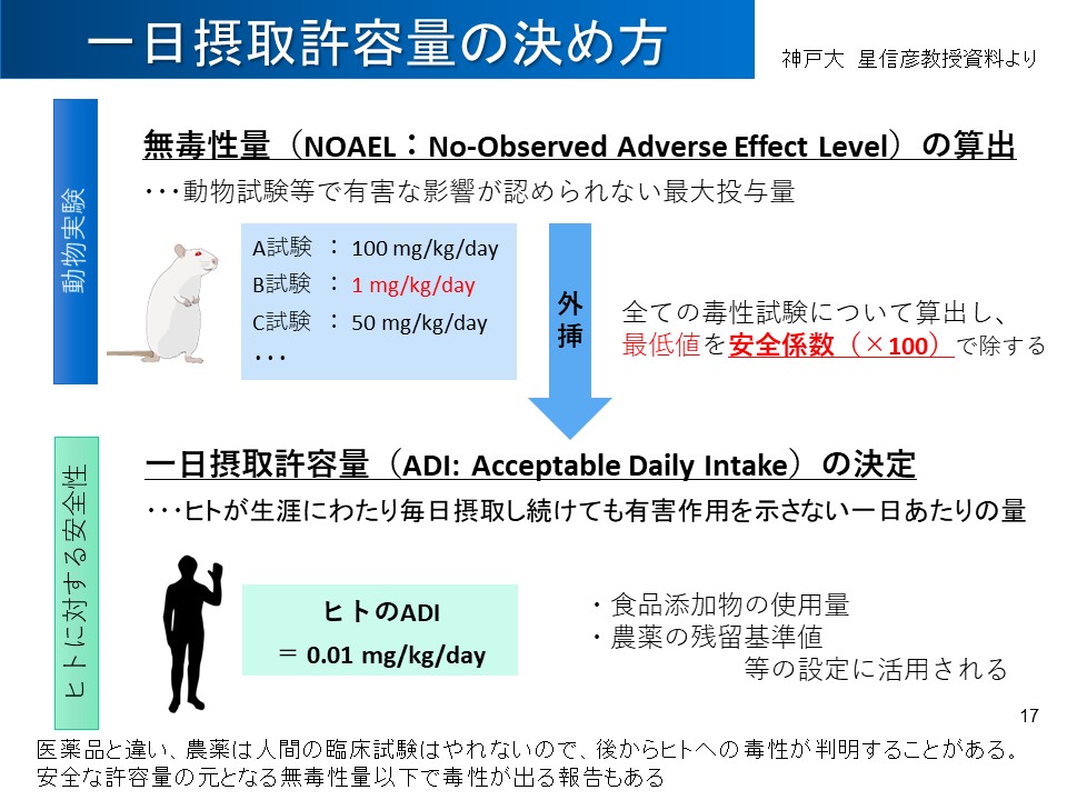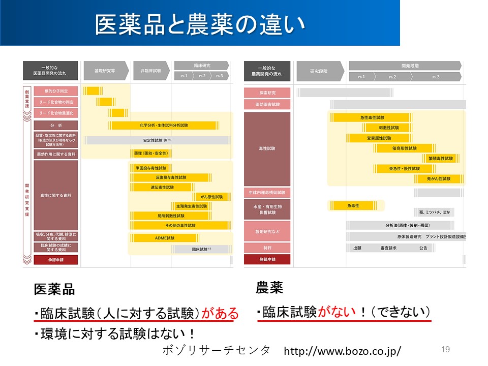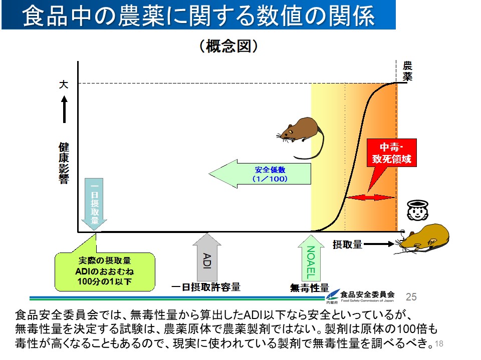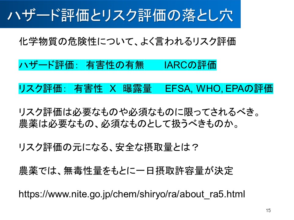 さらにWHOと国連食糧農業機関(FAO)が合同で、規制内でのグリホサート使用では発がん性はないと発表したので混乱に陥り、現在も議論が続けられています。ただし、この発表は、規制内でと但し書きが付いており、リスク評価(有害性X曝露量)の立場を取っています。IARCはハザード評価(有害性)を評価している違いがあることに注目してください。