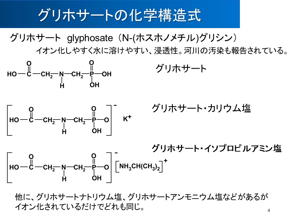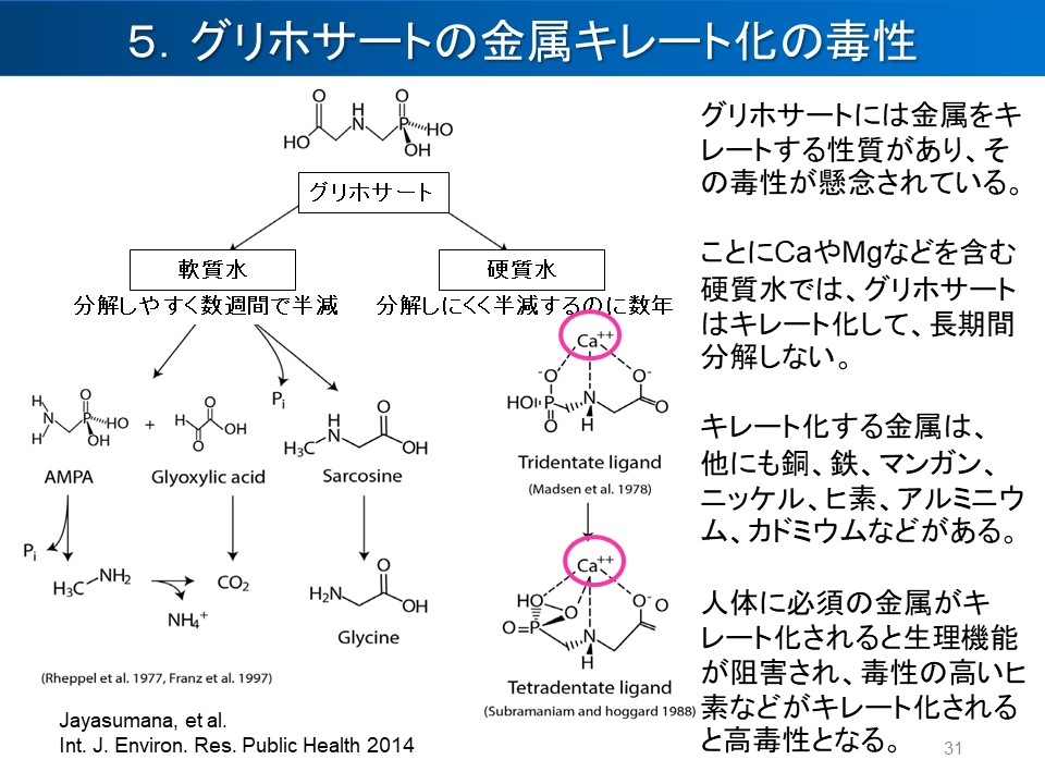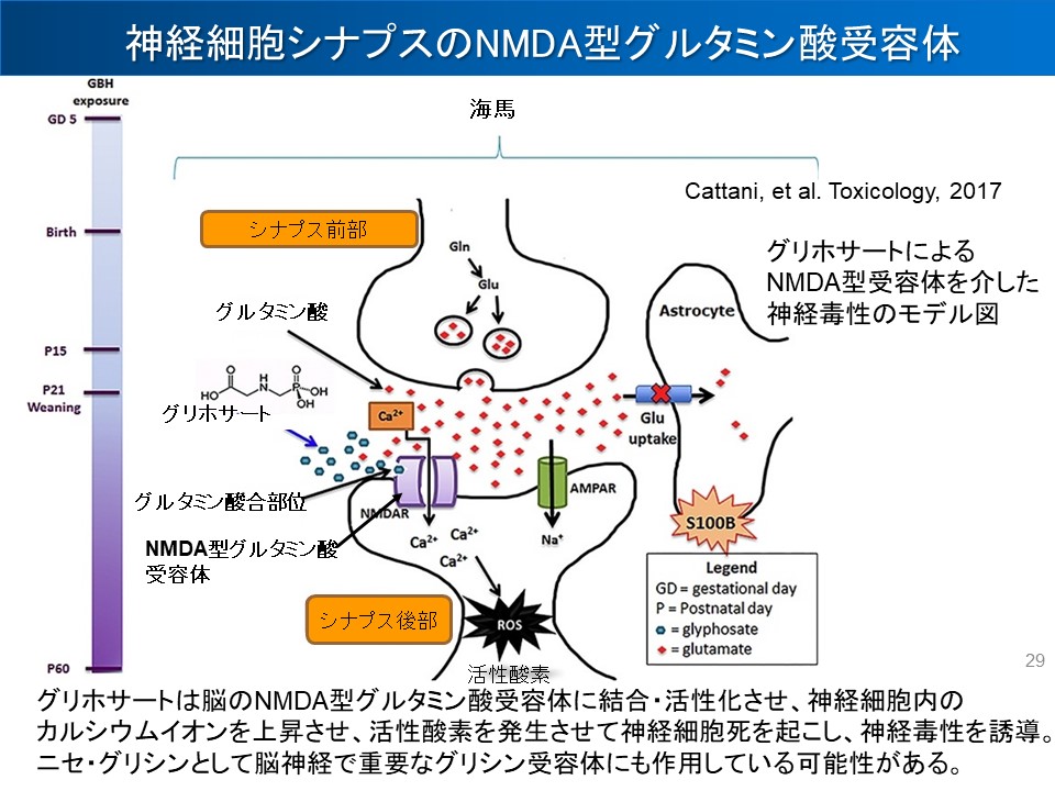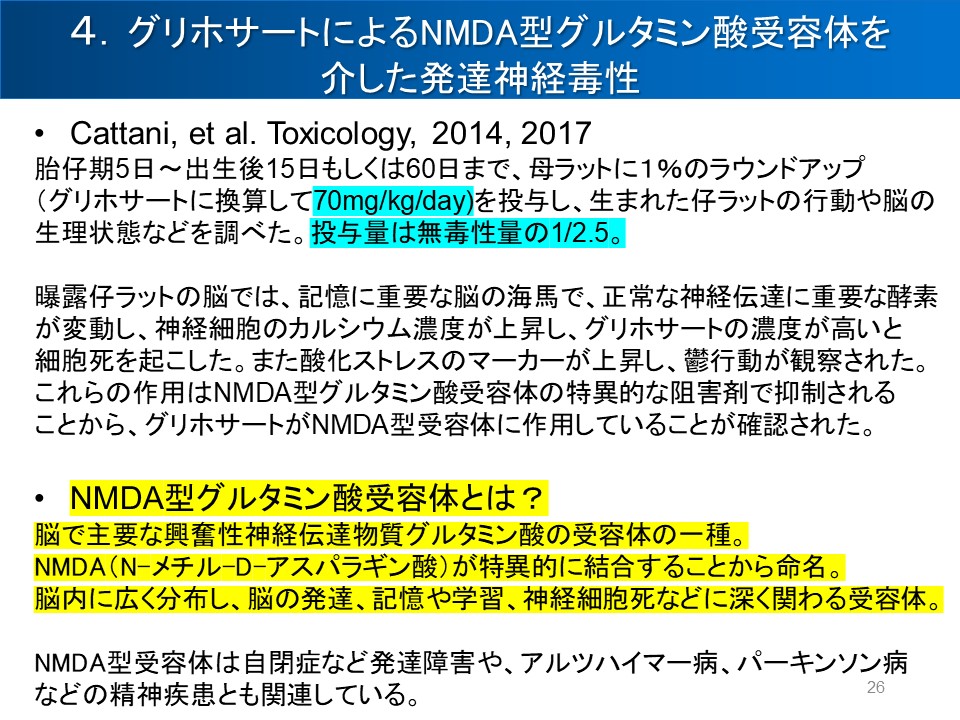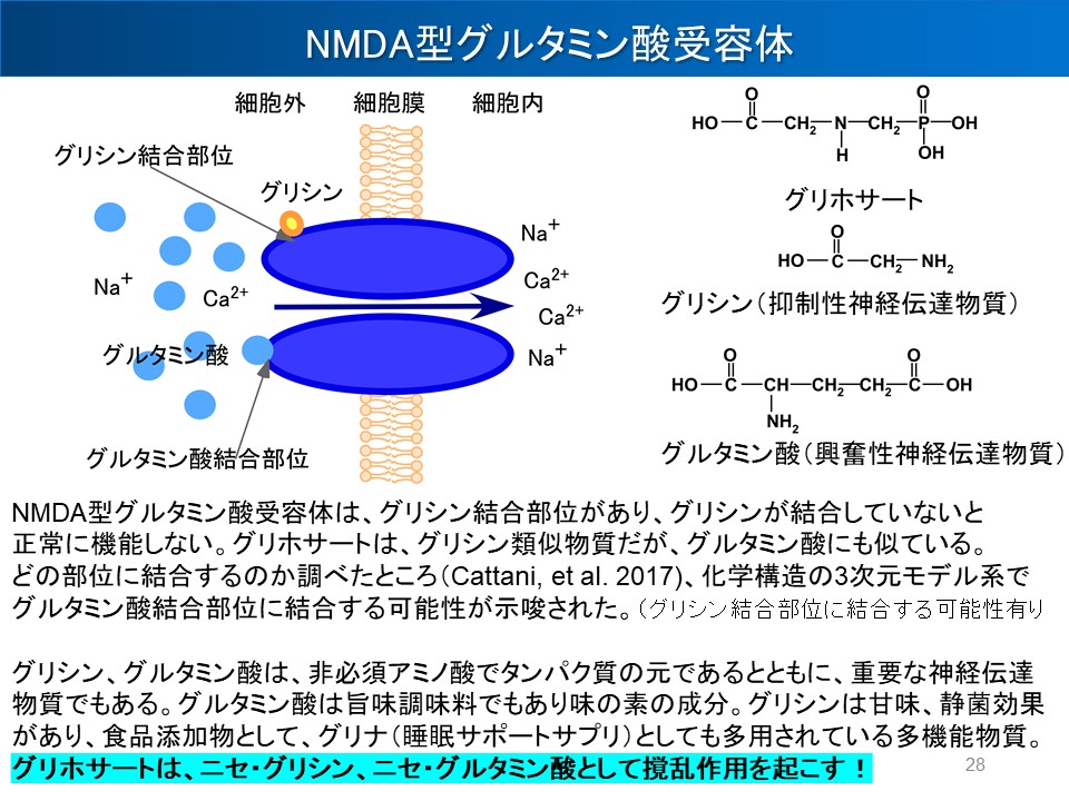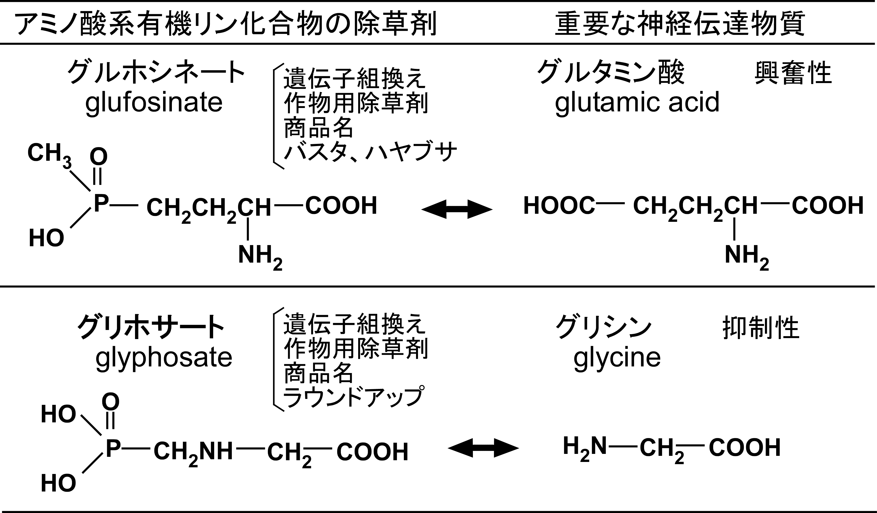 このため、グリホサートやグルホシネートは、ニセ・グリシン、ニセ・グルタミン酸として脳神経系を攪乱、阻害することが考えられ、動物実験などでは報告が増えてきています。