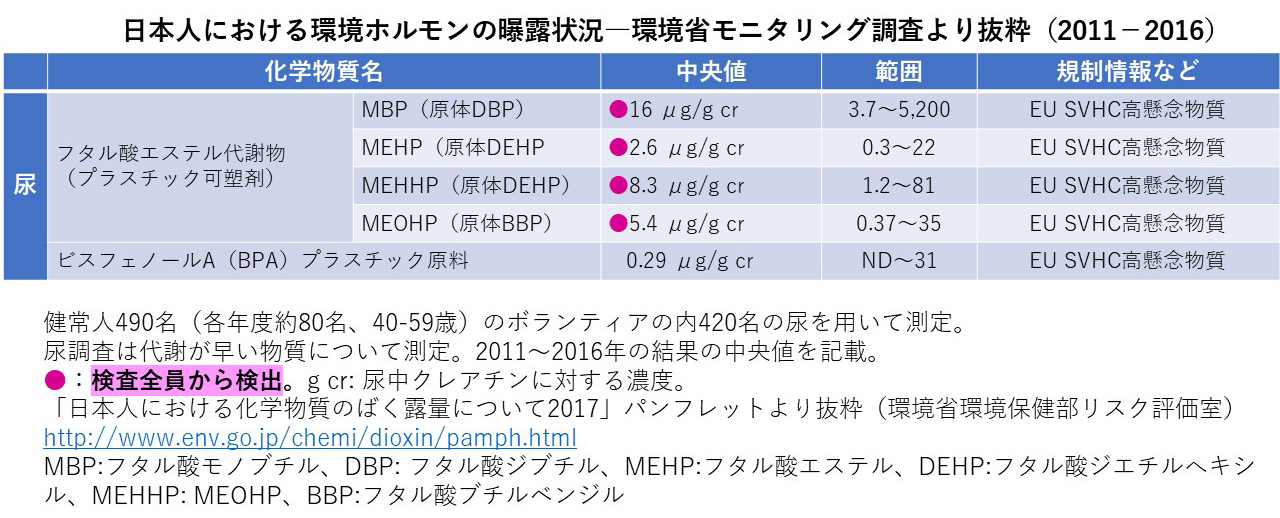 プラスチック類は、現在の日本では製品名しか表示されず、素材に何が入っているのか分かりませんが、環境省の調査によれば、日本人は複数の環境ホルモンに全員曝露していることが確認されています。