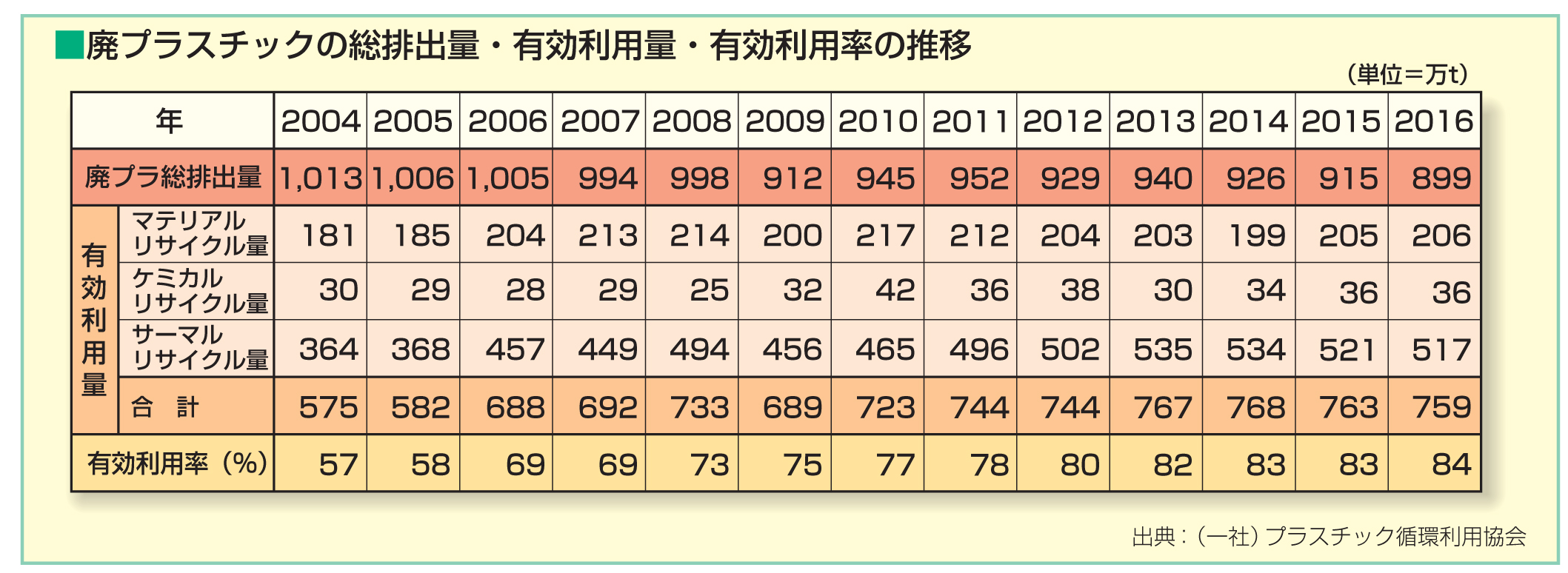(一社)プラスチック循環利用協会の資料によれば、2016年度プラスチック廃棄物の有効利用率は84%tとしていますが、その中の68%はサーマルリサイクルで、ほとんどを燃やしているのが実態です。